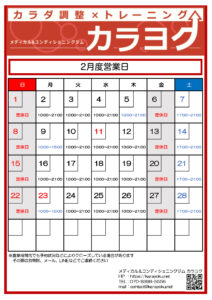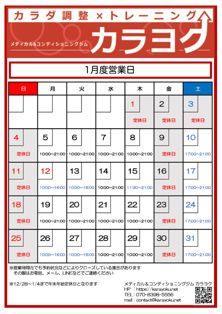1月度スケジュールのお知らせ 2025年12月25日 最終更新日時 : 2025年12月25日 karayoku 今年も残すところわずかとなりました。 1月度のスケジュールはこちらになります。 なお、12/28〜1/4まで年末年始のためお休みです。 宜しくお願い致します。